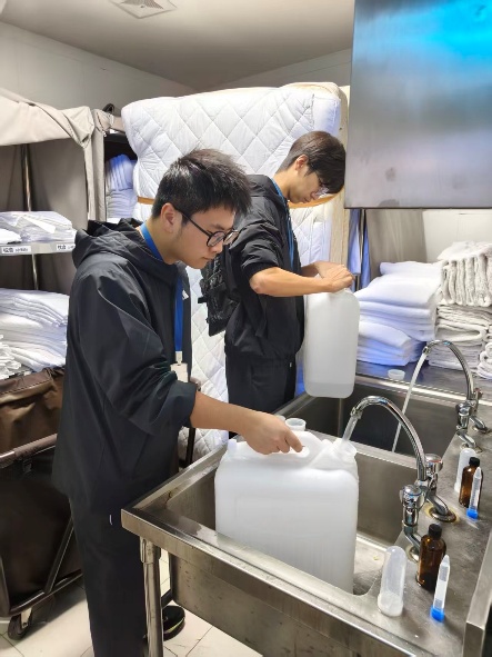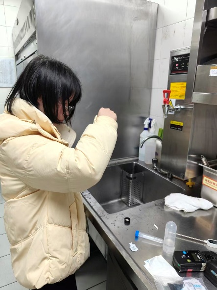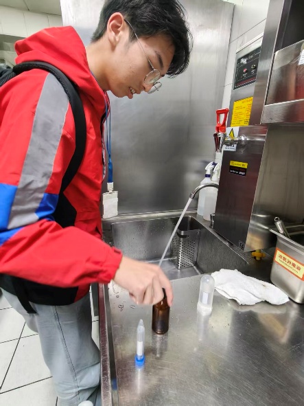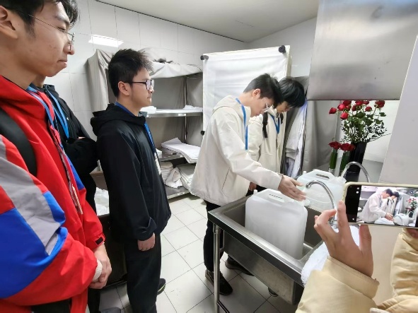 培训完毕后,同学们前往具有近百年历史的上海地标性建筑——和平饭店,正式开展实地采样与检测。在工作人员的详细介绍下,同学们首先对其供水系统架构、管网分布及日常水质管理措施进行了实地调研与学习。随后,在课题组专业人员和饭店技术人员的协同指导下,各小组严格遵循标准作业程序,执行“先放流、后采样”操作,于多个预设点位成功采集水样。过程中,同学们运用便携式水质快速检测设备,对余氯、温度等多项关键指标的现场初步检测。所有采集样本均按规定保存并送至实验室,进行包括感官性状、微生物指标、常规化学及毒理指标在内的系统化精密分析。