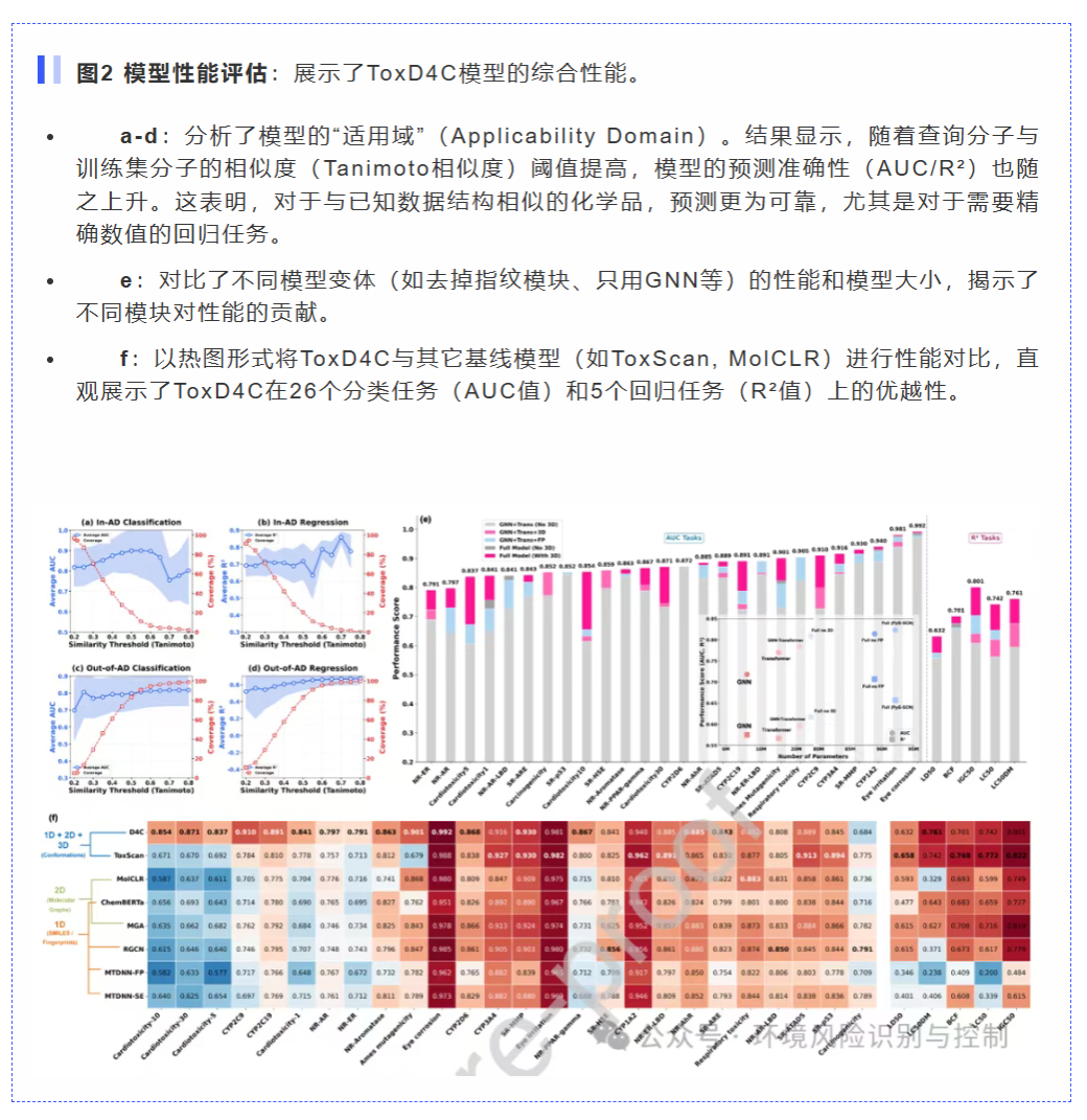 基准测试(图2f): 在包含31个毒性终点的全面基准测试中,ToxD4C的平均AUC达到0.845,优于ToxScan(0.827)等现有方法。在关键的环境终点上表现尤其出色,如生物浓缩系数(BCF)的R²值为0.701。