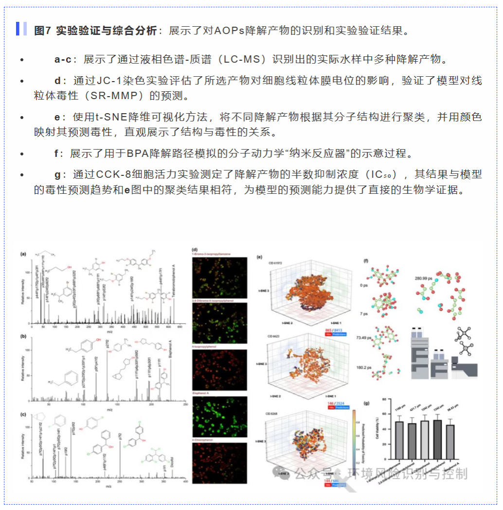 模拟真实反应环境的“纳米反应器”(图4e): 这是最大胆、最创新的部分。作者利用“元动力学(Metadynamics)”技术,构建了一个虚拟的“纳米反应器”。在这个反应器里,BPA分子在模拟的高级氧化条件下自由翻滚、碰撞、分解。模型则像一个“鹰眼”实时监控,同步输出分子的能量、结构变化(RMSD)以及毒性概率(Uni-Mol probability)和LC₅₀/IGC₅₀值。我们能直观看到,随着反应进行、产物逐渐稳定,毒性预测值也趋于平稳,这完美模拟了从高能反应中间体到稳定产物的毒性演变过程,极具说服力。