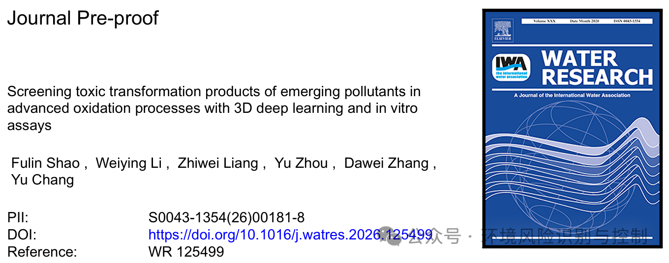 文献引用:1 F. Shao, W. Li, Z. Liang, Y. Zhou, D. Zhang, Y. Chang, Screening toxic transformation products of emerging pollutants in advanced oxidation processes with 3D deep learning and in vitro assays, Water Research (2026), doi: https://doi.org/10.1016/j.watres.2026.125499.