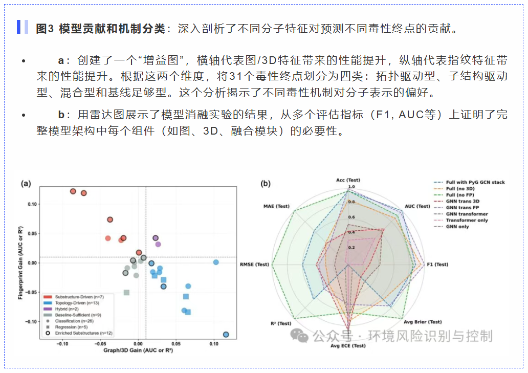 架构的必要性(图3): 通过“消融实验”证明,对于依赖分子整体形状和空间构象的毒性终点(如CYP3A4和NR-PPAR-γ),3D特征的引入带来了高达0.1157的性能增益,证实了3D信息的不可或缺性。