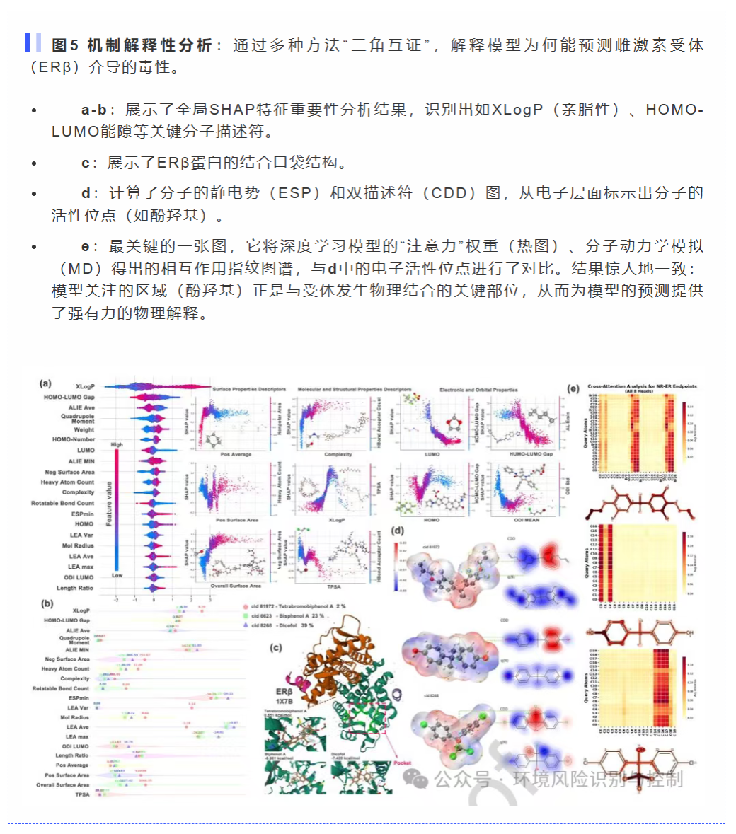 从“黑箱”到“透明”的机理解释(图5): 最精彩的部分在于,作者没有止步于预测“毒不毒”,而是要搞清楚“为什么毒”。他们通过“机理三角验证法”,将深度学习的注意力权重(模型认为哪里重要)、DFT计算的电子反应性图谱(ESP/CDD,化学上哪里活泼)以及分子对接的相互作用指纹(物理上如何结合)完美地统一起来。结果惊人地一致:模型关注的酚羟基和卤代环区域,恰好是电子云最富集/亏缺的地方,也正是与雌激素受体(ERβ)结合最紧密的“热点区域”。这套组合拳,把一个看似“黑箱”的AI预测,变成了一个有物理化学基础、可解释的科学结论。