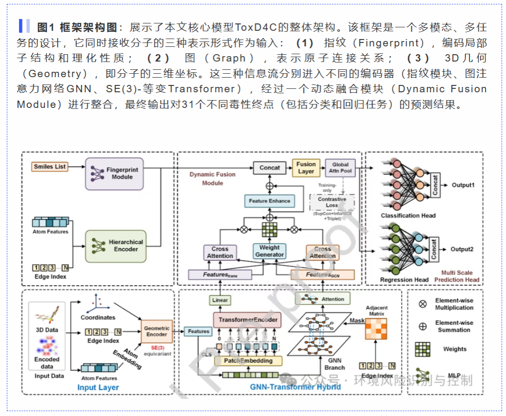 开发了一个名为ToxD4C的新型多模态深度学习框架。它不只看2D结构,而是独特地整合了三维分子几何构象、图注意力网络和SE(3)-等变Transformer架构。