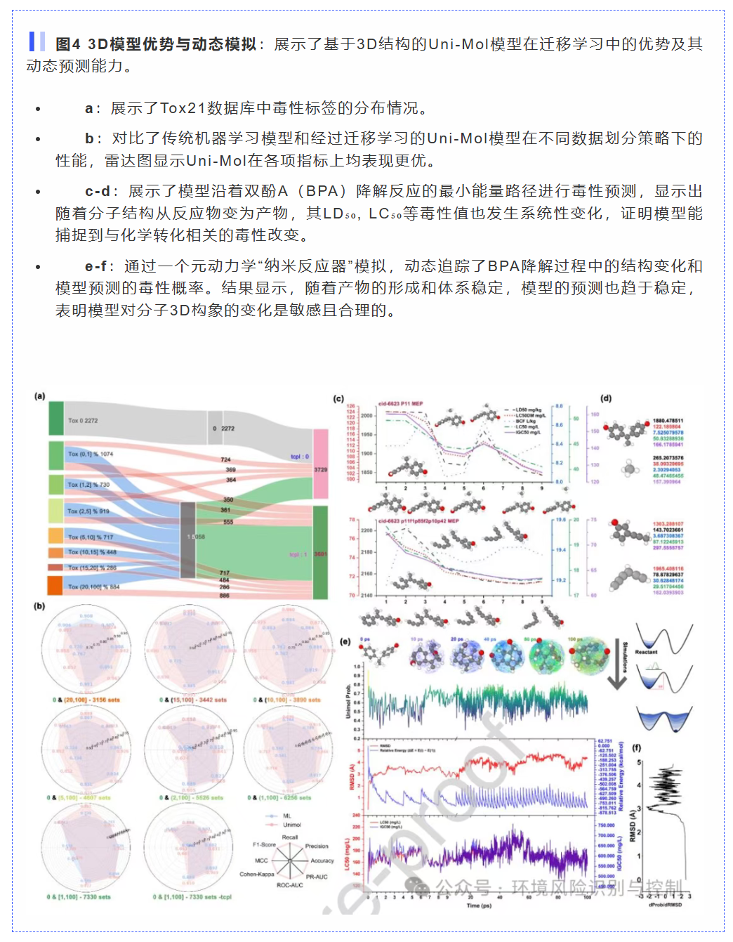 动态毒性追踪(图4c-f): 在模拟BPA降解的反应路径上,模型能够根据分子三维构象的连续变化,预测出毒性指标(如LC₅₀)的平滑演变。这在2D模型中是无法实现的,有力地证明了模型学到的是真实的“构效关系”,而非简单的碎片记忆。